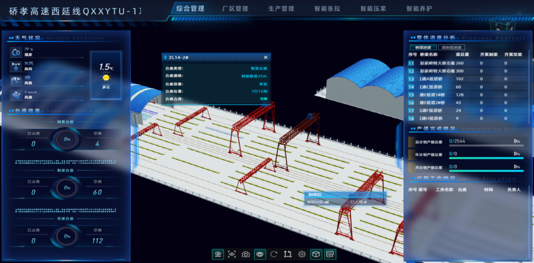 联投湖北路桥硚孝西项目通过三大维度实现传统基建革新:生产端以智能工装、智慧拌合站构建数字化生产体系,为构件赋予全生命周期“数字基因”;现场端靠无人机巡检、智能顶推系统等装备,实现高危工序精准管控与“无人化”作业;管理端搭建一体化协同平台,打通BIM模型与物联网数据,形成数字孪生与在线协同闭环。