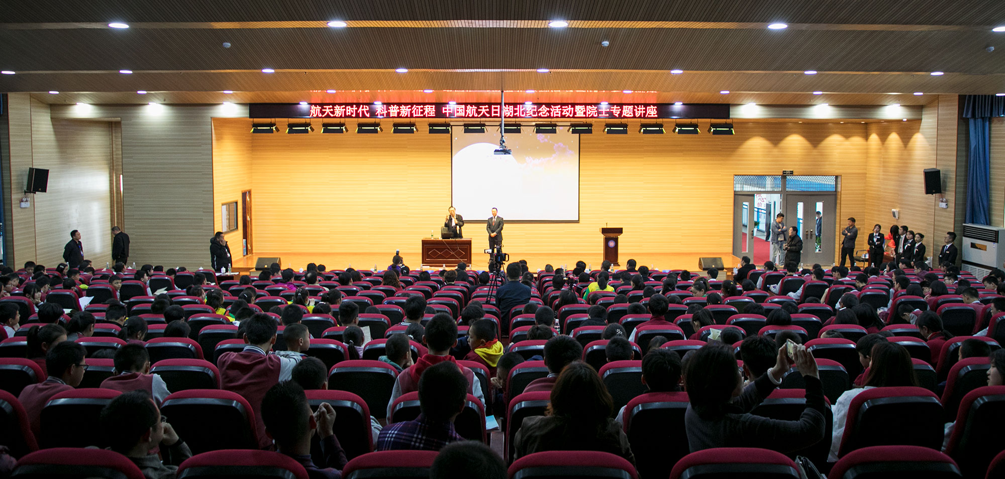 两弹一星功勋科学家、中国科学院院士孙家栋,中国月球探测工程首席科学家、中国科学院院士欧阳自远;咸宁副市长吴刚;联投集团副总经理汪继明,梓山湖公司总经理薛蓉;湖北省科协、湖北科技学院、咸宁市教育局、科技局、文化和旅游局、市科协等单位领导到场出席了讲座。梓山湖航天科技馆负责人陈明洋先生主持活动现场。